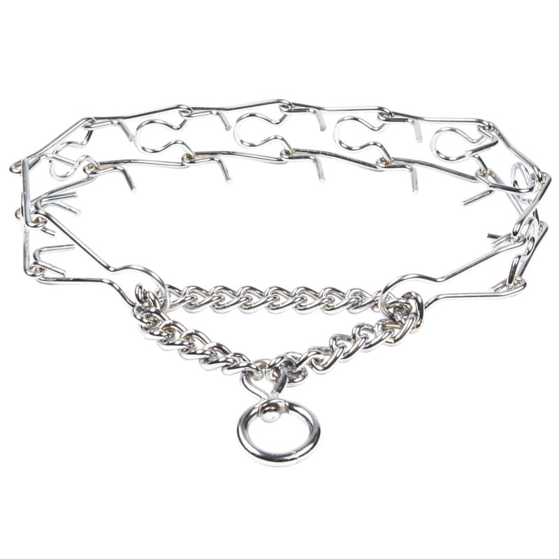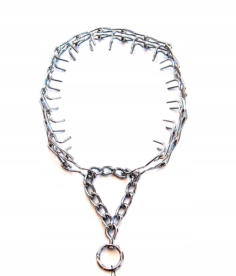 Kolczatka wykonana z chromowanego metalu, z mechanizmem zapobiegającym zaciśnięciu się obroży zbyt mocno.